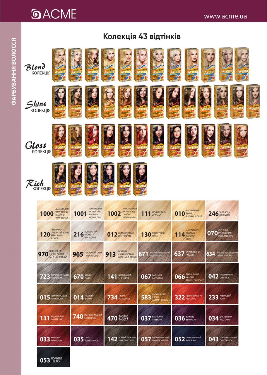 Зверніть увагу в фарбах AVENA: відтінки 1000, 1001, 1002, 723, 246, 216, 120, 114, 111, 010 не рекомендуються для волосся, де сивини понад 70%.