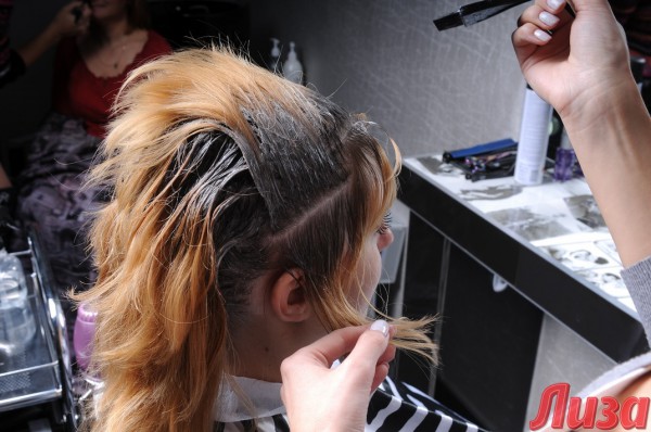 - Чтобы выровнять цвет, мастер наносит на корни краску более темного оттенка, чем на всю длину волос.