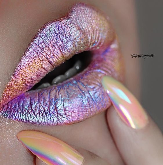 Голографічні помади У 2018 році набрав шалену популярність ефект голографіка. Кольорові хайлайтери, які змушують твою шкіру сяяти всіма кольорами веселки, тіні, що переливаються з одного відтінку в інший і, зрозуміло, такий гучний тренд не міг обійти помади. Казковий образ, подібний до феї, не дивлячись на свою незвичність і сміливість, привертає увагу багатьох модниць.