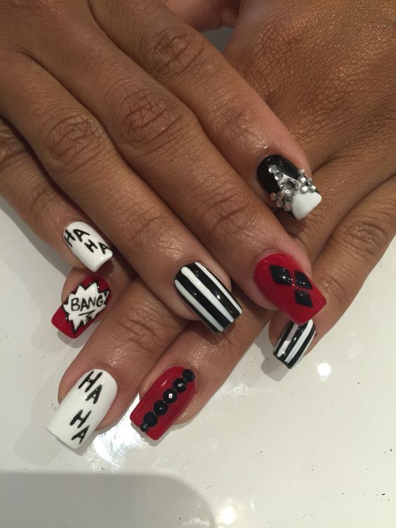 Покрокове відео як зробити макіяж Халки Квін. МанікюрЩе одна важлива деталь та простір для творчості. У фільмі у Харлі кожен палець був нафарбований по-різному. Але ти можеш експериментувати зі складними малюнками, або нафарбувати нігті в червоно-синій або чорно-червоній гамі.