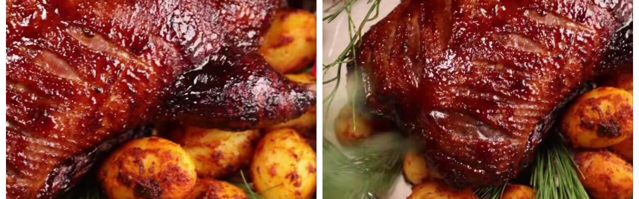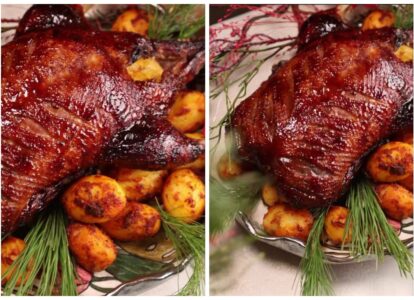 Через годину додайте до качки змащену в спеціях картоплю. Температуру в духовці зменши до 130°C і готуй ще 1,5 години. Ектор Хіменес-Браво радить періодично змащувати птаха глазур’ю. Тоді м’ясо матиме ідеальний блиск, як у програмах із кулінарії.