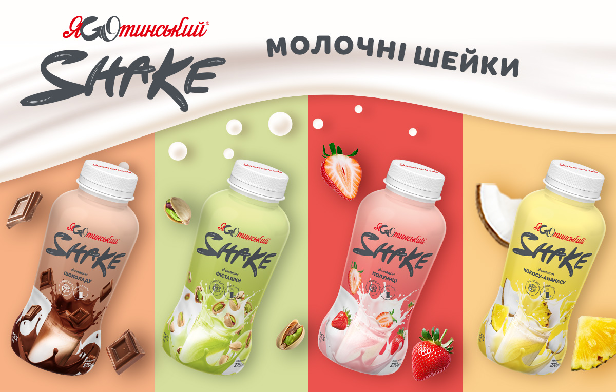 ТМ «Яготинське» презентує молочні шейки, представлені чотирма смаками: полуниця, фісташка, шоколад, кокос-ананас. Це нова категорія, адже вперше бренд запускає лінійку українських молочних коктейлів.