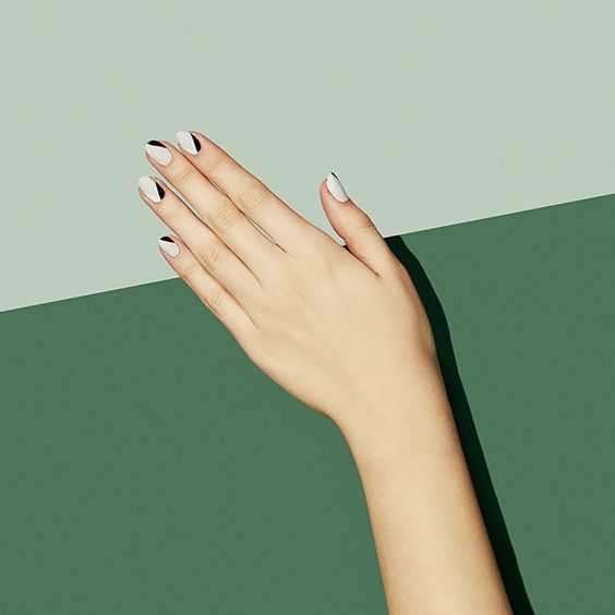 Подойдёт классический лунный маникюр полукругом, или геометрический треугольник, или двойная дуга, или выкрашенный ноготь не только в нижней части, но и в верхней — здесь всё зависит только от твоих предпочтений.