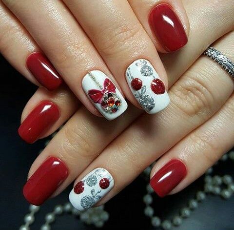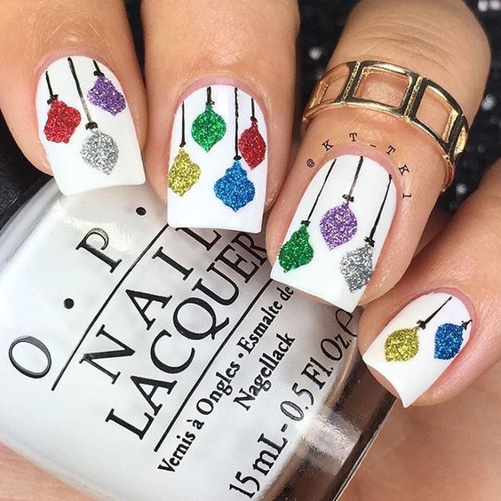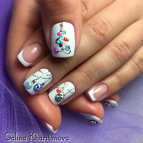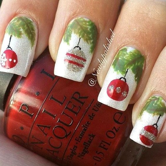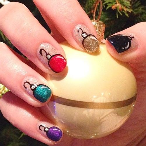На своих ногтях можно изобразить отдельные игрушки, висящие на елочных ветках игрушки, схематичные игрушки, гирлянды и свечки — как и в реальности, выбор украшений для рисунка ногтей чрезвычайно велик.