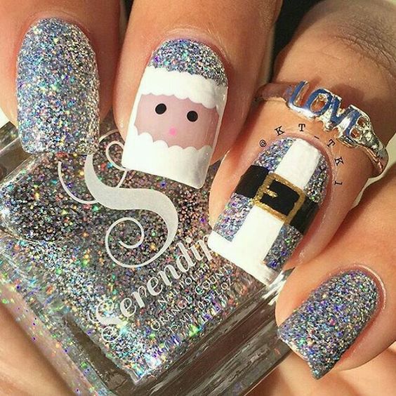 Ну и какой же новогодний маникюр без главного героя — Санта Клауса или Деда Мороза по местному обычаю. Санта может быть изображен в полный рост, можно нанести только голову с бородой и узнаваемый колпак, а можно и вовсе одни лишь детали шубки с поясом.
