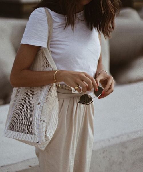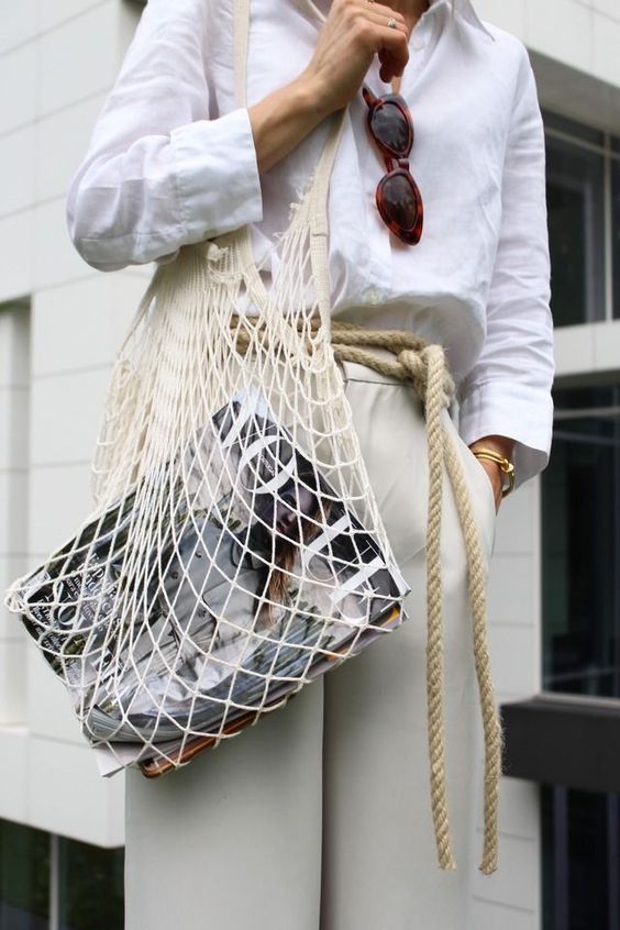 Нам она знакома под названием авоська. Ироничный тренд, который оказался чрезвычайно удобным для лета. В такой сумке особенно эффектно выглядит багет и модный журнал, но фрукты, персональная бутылка с водой и косметичка геометрической формы также будут к месту. Если тебе не нравится прозрачность, положи в авоську небольшую сумочку и сложи все вещи в нее.