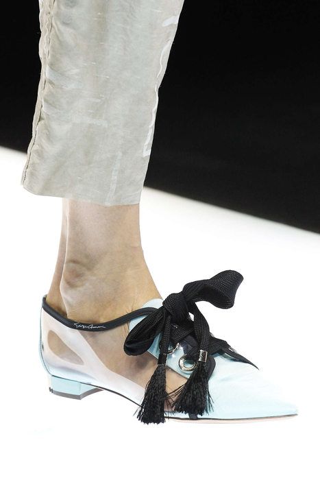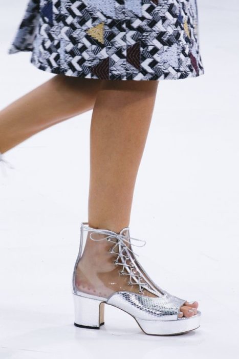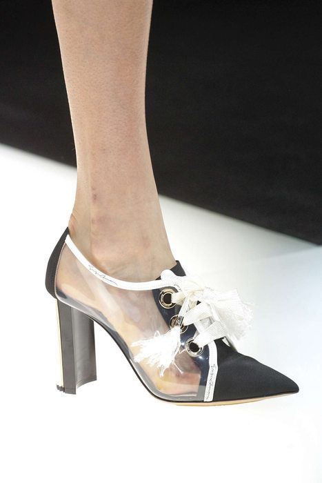 Если говорить об обуви, то в тренде либо полная прозрачность из пластика, либо комбинация кожи и прозрачных вставок. Красивые и модные модели ботинок, туфель и босоножек с элементами из пластика представлены в коллекциях A-Wang, Chanel, Giorgio Armani, Valentino и других именитых дизайнеров.