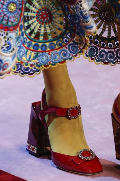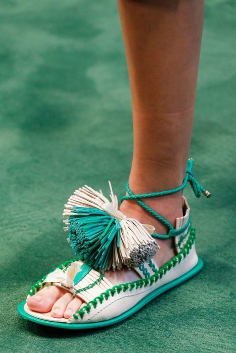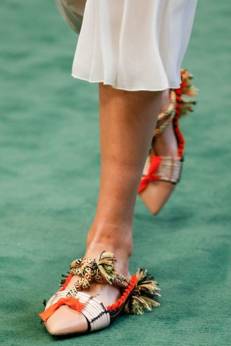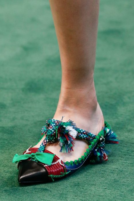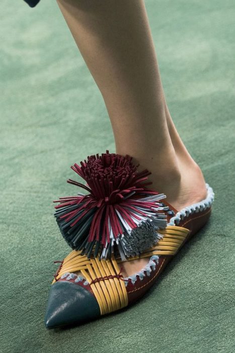 В 2018 году популярна будет также обувь с вышивкой, паетками, декорированная камнями, пряжками, крупным глиттером и бахромой. В общем, не пропусти всё, что сверкает и переливается, и ты точно попадешь в яблочко.