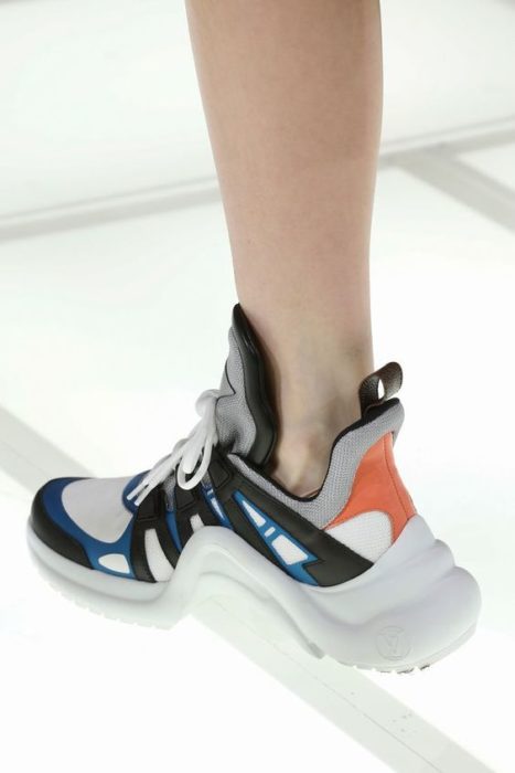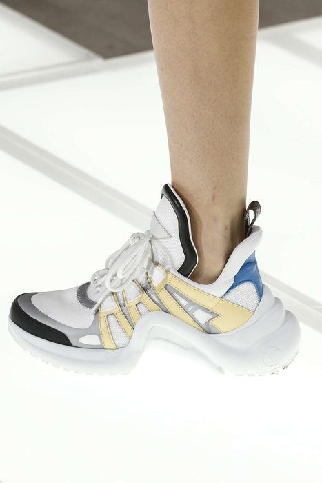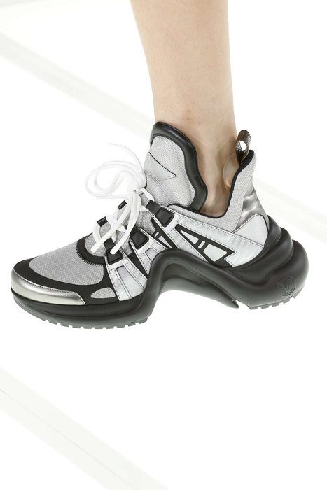 Кроссовки на толстой прорезиненной подошве с аппликациями, витиеватой шнуровкой и вставками из пластика, металла, меха, перьев и чего угодно еще сегодня носят и в оперу, и в офис, и на вечеринку. Такие бренды, как Loewe, Celine, Louis Vuitton и Maison Martin Margiela представили разнообразие массивных моделей спортивной обуви.
