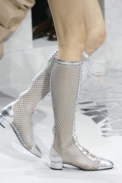 Это могут быть как туфли на шпильке, так и бодфорты в сочетании с укороченными трикотажными платьями или ультрамодными шортами. Особенно стоит отметить высокую обувь с завязками.