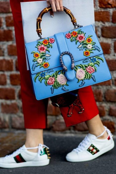 В 1950-х годах появилась знаменитая сейчас на весь мир полосатая тесьма Gucci, прообразом которой выступила подпруга седла, а также мокасины с металлическими элементами, которые в наши дни ассоциируются только с этим брендом.