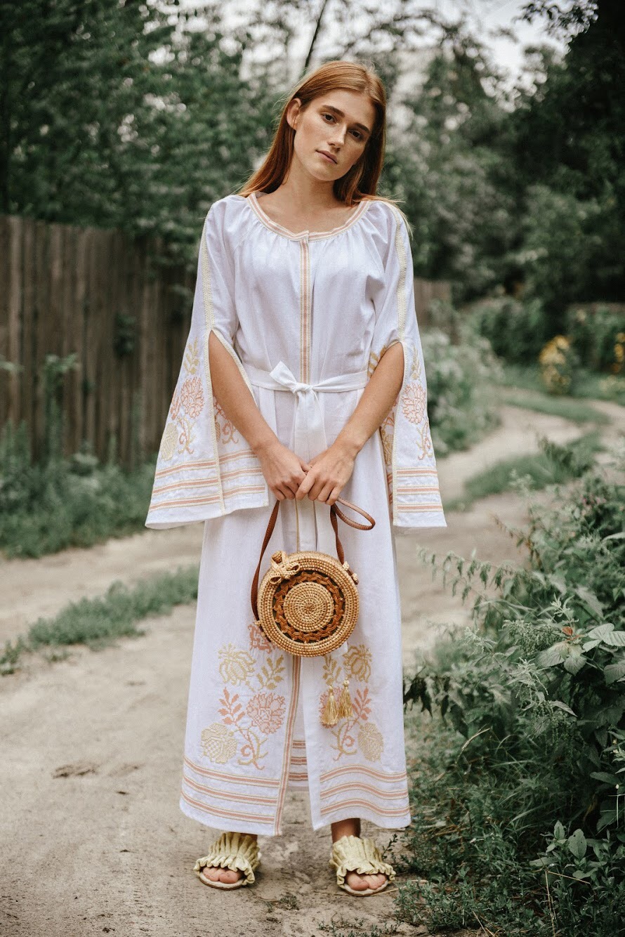 Вышиванки украшены гладью дерзких и модных оттенков — золота, розового и пурпура. Такие детали делают традиционное украинское платье актуальным в любой из дней, не только в национальные праздники. Одна из моделей украшена белоснежной аппликацией на прозрачных вставках, напоминающей цветы, которые россыпью упали на платье от дуновения ветра.