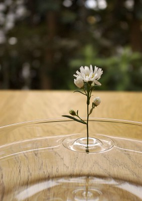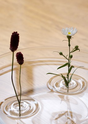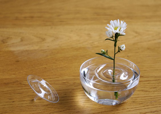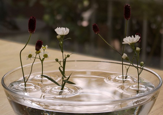 Потрясающую по своей красоте и простоте идею реализовали дизайнеры японской студии ooDesign. Ваза или даже скорее держатель для небольшого цветка с тонким стеблем, помещенная в миску или другую емкость с водой, визуально напоминает круги, расходящиеся от брошенного в воду предмета.