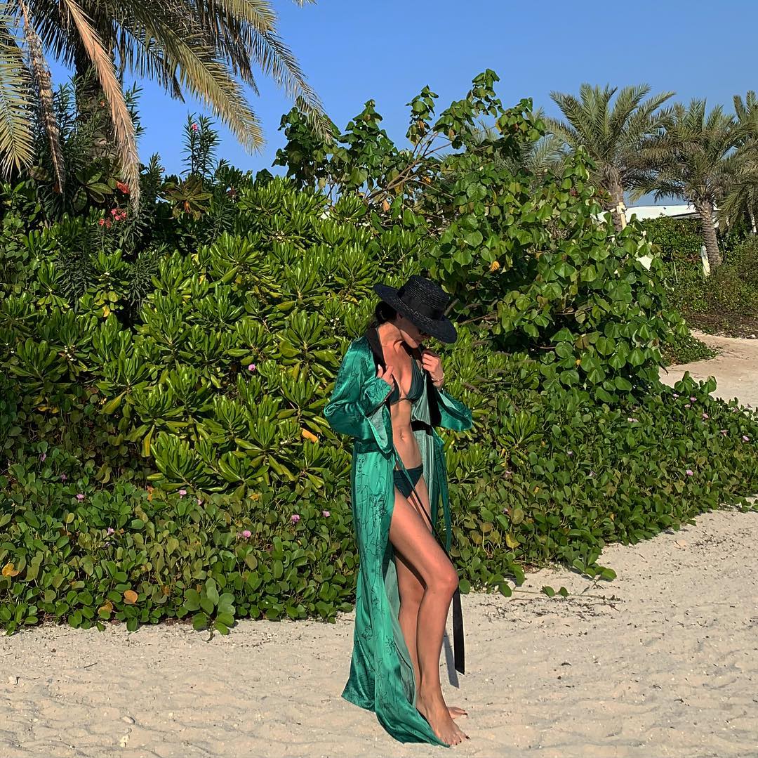 Как мы можем наблюдать, Маша позирует на фоне местной флоры в бикини. Придавал эффекта и яркости небрежно наброшенный сверху изумрудный шелковый халат и шляпа.