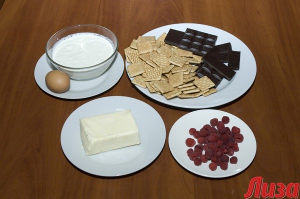 - Подготовь необходимые продукты: крекеры, шоколад, сливочное масло, сливки, яйцо и малину.