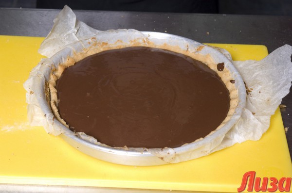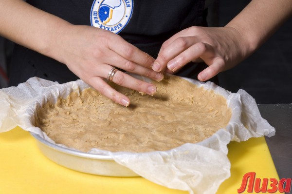 - Смочи пергамент водой и выстели им форму для запекания, смажь бумагу сливочным маслом. Выложи смесь из крекера и масла в емкость, сформируй бортики. Помни, толщина коржа везде должна быть одинаковой.