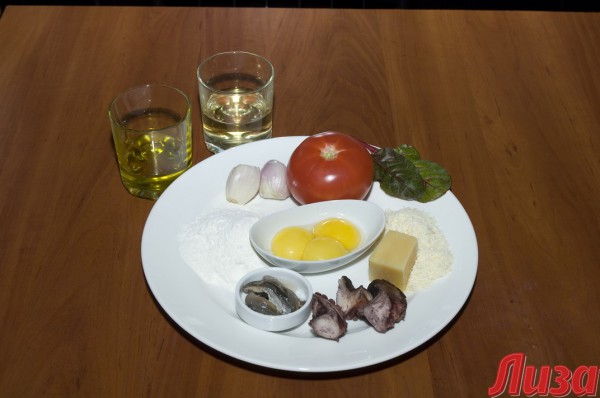 - Подготовь все необходимые продукты: муку, куриные желтки, помидор, лук шалот, осьминог, анчоусы, вино, оливковое масло, пармезан и дальше по списку…