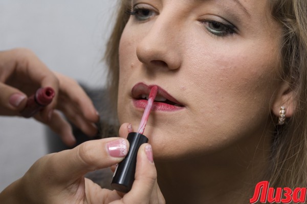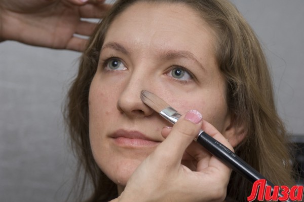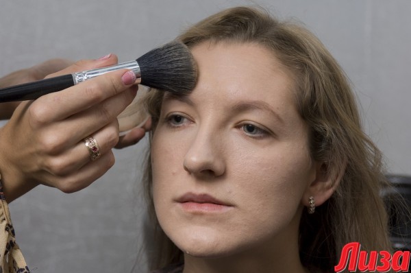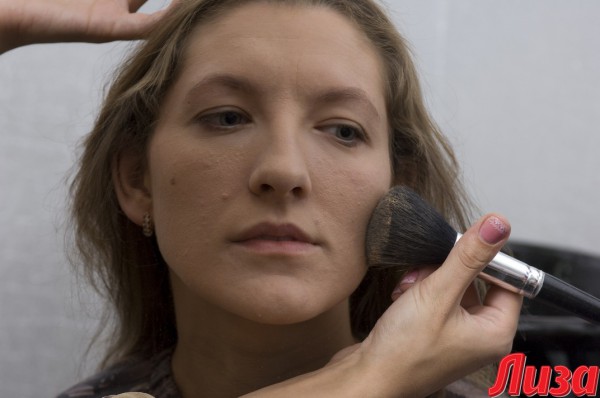 Умелый макияж может исправить некоторые мелкие недостатки. Например, у Таи слегка смещен подбородок. Для корректировки этой зоны Светлана делает светлый акцент не по центру, а чуть в стороне и затушевывает смещенную сторону более темным оттенком пудры.