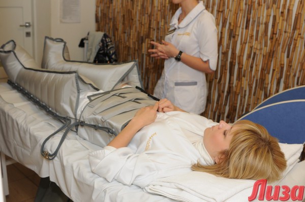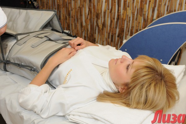 Тоня отважилась пройти сеанс прессотерапии. Для проведения этой процедуры на руки, ноги и область живота девушки надели специальные манжеты, в которые под давлением подается воздух, при помощи которого осуществляется массаж.