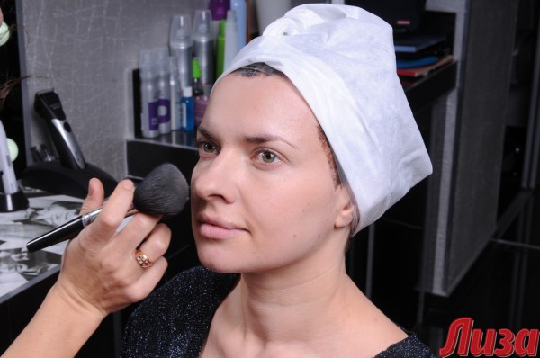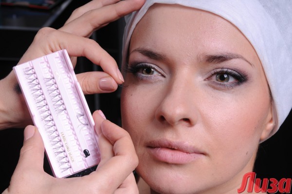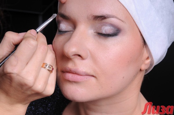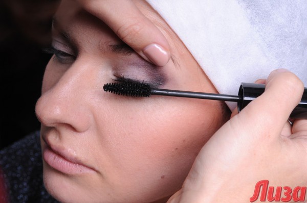 При помощи кисти и румян мастер «вытянула» черты лица девушки, а затем создала make up в стиле «лисий глаз». Для усиления эффекта Светлана использовала накладные ресницы в уголках глаз.