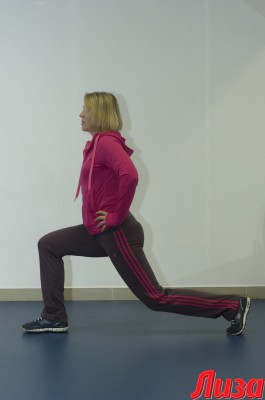 Исходное положение — ноги чуть расставлены. Делай поочередные выпады вперед правой и левой ногой. Ногу, совершающую выпад, старайся зафиксировать под прямым углом. Заднюю ногу тяни, стараясь коснуться пола. Делай не менее 15 выпадов на каждую ногу. При выполнении этого упражнения отлично работают мышцы задней поверхности бедер, ягодичные и икроножные мышцы.