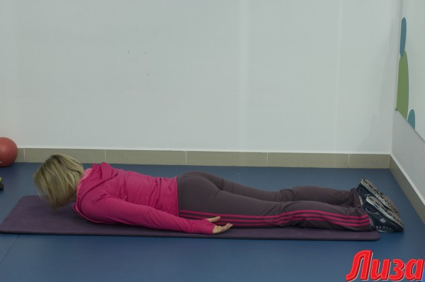 - Исходное положение — лежа на животе, руки вдоль тела.