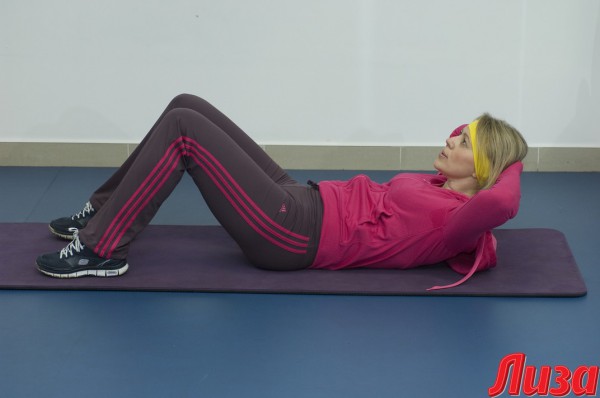 - Исходное положение — лежа на спине, ноги согнуты, руки на затылке.
