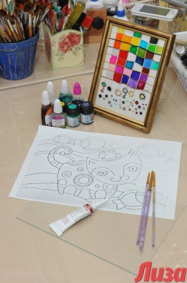 - Для работы Наташе понадобилась схема рисунка в натуральную величину, стекло по размеру рисунка, спиртовое средство для обезжиривания, контур и краски для витража, а еще кисточки.