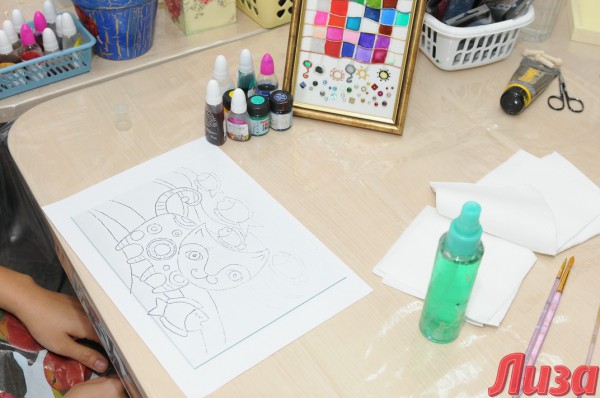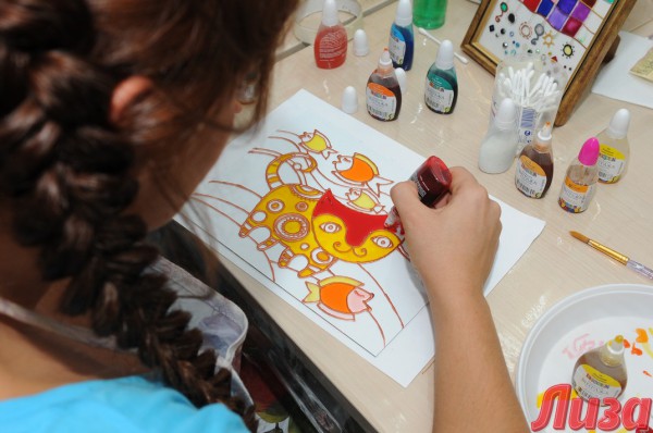 - «Ячейки» витража необходимо заполнить витражными красками. Небольшие Наташа прорисовывала носиком тюбика, а те, которые покрупнее, зарисовывала кисточками.
