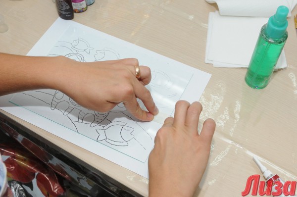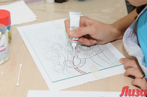 - При помощи витражного контура Наташа перевела рисунок на стекло.