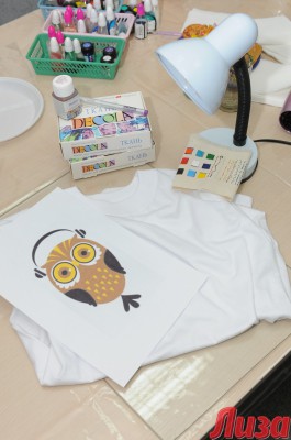 - Для работы Инне понадобились краски для текстиля, кисточки разного размера, исчезающий маркер для рисования на ткани, небольшой мольберт, стекло, настольная лампа, схема рисунка в натуральную величину, булавки, файл для бумаг и, конечно, выглаженная футболка.