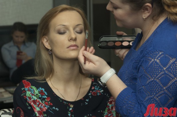 У Юли правильные черты лица и выразительные голубые глаза. Чтобы подчеркнуть их, мы сделали тенями золотистых оттенков эффект smoky-eyes.