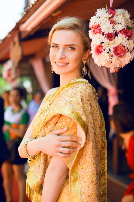 Венчание проходило в самом крупном частном парке Азии, недалеко от города Паттайи. Ребята были одеты в традиционные тайские наряды, а сама церемония проходила по всем национальным канонам.Тайські весільні традиції Аня чекала на Рому в спеціальному дерев’яному будиночку, на високих дерев’яних палях, у парку, де вона провела ніч до церемонії. У свою чергу, Рома з’явився верхи на слоні разом з великою кількістю людей (акторів театру), які супроводжували нареченого та приносили нареченій дари: фрукти, різні смаколики та солодощі.«У тайських костюмах було комфортно. Краще, ніж у сорочці у таку спеку. Але ось із взуттям була проблема. Я був у своїх туфлях, тому що тайці не мають чоловічого взуття мого розміру. Так, я їхав на слоні у класичних туфлях, привезених з України!», – розповідає Рома Грищук. Церемонию бракосочетания проводил настоящий старейшина по всем правилам и канонам. Он и определил, кто из пары станет главой семьи и хранителем очага. Если по украинским традициям главой семьи становится тот, кто первым станет на рушник, то в Таиланде сам старейшина выбирает главу семейства. Во время церемонии он обвязал ребятам руки повязкой для обрядов, а после снял ее и отдал Ане, назначив девушку хранительницей очага. Обычно по традиции свадебная церемония в Тайланде начинается с буддийского храма, после чего следует венчание, но поскольку Рома и Аня не буддисты — ребята вначале прошли церемонию, и только после этого им было разрешено ехать в храм. Там молодых венчал буддийский священник, который, по наблюдению ребят, был подозрительно похож на Барака Обаму.