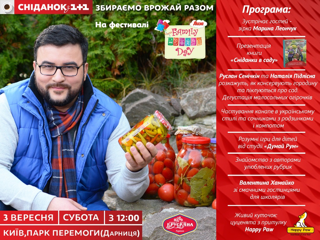 Чарівна ведуча заходи – Марина Леончук, а в гості до неї приїдуть автори книги “Сніданки у саду” Руслан Сенічкін и Наталія Підлісна, які пригощатимуть відвідувачів хрусткими малосольними огірками та фруктовим компотом, а також розкажуть про секрети кулінарії та садівництва. ???????????????????????????????????? Книга “Сніданки в саду” пропонує різноманітні смачні пропозиції осінніх сніданків, пікніків, домашніх трапез із стравами із натуральних продуктів. Цікавими гостями на святі стануть провідні рубрик програми “Сніданок.Вихідний” – Гліб Репіч та Таміла Чехович. Які новинки чекають на вас у новому сезоні рубрик Сніданку? Як зберегти вітаміни при консервуванні овочів та фруктів? Як правильно доглядати за садом восени? Все це ви зможете дізнатись на майданчику “Сніданок восени”. Валентина Хамайко, ведуча рубрики “Солодка Неділя”, почастує гостей домашньою випічкою – сочниками з сиром та родзинками, які так зручно давати дітям із собою до школи. Гості заходу отримають корисні подарунки від ТМ “Брусв’яна” – саджанці канадської лохини. Діти зможуть взяти участь у цікавій та пізнавальній програмі від аніматорів студії “ДумайРум”. Snidanok_267 Створювати затишок допомагає художник-декоратор Ольга Грузд із Celebration event decor studio.Марина Леончук запрошує: “Як виховують дітей тата? Звичайно, не так як мами. Чоловіки взагалі зовсім інші, і виховують по-іншому, і спілкуються з дітьми по-іншому, але якраз у цьому різноманітті – радість та щастя. Довіряйте татам, цінуйте їхню участь і просто любите їх – Family Day цього разу влаштує справжнє свято для тат. Події, які відбуватимуться на майданчику, транслюватимуться на сторінці Сніданок з 1+1 у мережі Facebook, де кожен бажаючий зможе віртуально приєднатися до заходу. Яскраву книжку-подарунок про садівництво з нового ракурсу та секрети смачних та корисних страв з яскравими ілюстраціями та практичними порадами шукайте та замовляйте по за посиланням.Бекстейдж: як створювалася книга “Сніданки у саду”